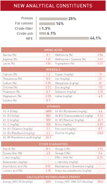 Protein gia cầm, bột bắp, bắp, bột lúa mì, chất béo động vật, protein thịt heo*, lúa mì, protein động vật, củ cải đường, dầu cá, khoáng chất, dầu đậu nành, men, men thủy phân (nguồn manno-oligo-sacarit) (0,05%).