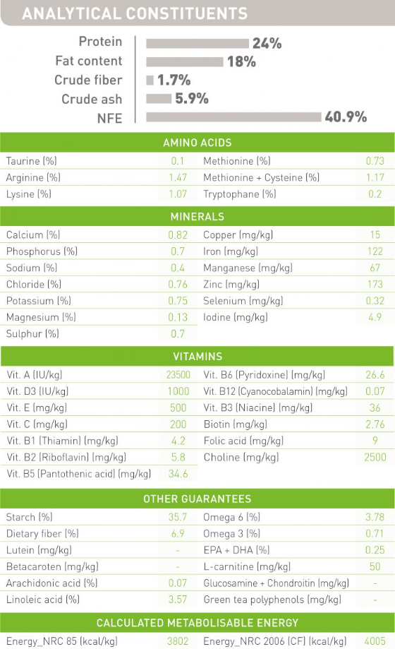 Gạo, protein gia cầm, bắp, chất béo động vật, bột bắp, gluten bắp, protein động vật, protein thực vật*, cải diếp xoăn, khoáng chất, dầu đậu nành, dầu cá, psyllium (1%), men, fructo-oligo-sacarit.